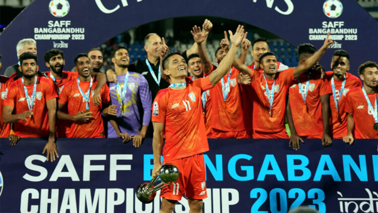 സാഫ് കപ്പിൽ ഒമ്പതാം തവണയും മുത്തമിട്ട ഇന്ത്യൻ ടീമിനെ അഭിനന്ദിച്ച് പ്രധാനമന്ത്രി നരേന്ദ്രമോദിയും കേന്ദ്ര കായിക മന്ത്രി അനുരാഗ് ഠാക്കൂറും. ഏഷ്യയിലെ കറുത്ത കുതിരകളെന്ന് അറിയപ്പെടുന്ന കുവൈറ്റിനെ പെനാൽറ്റി ഷൂട്ടൗട്ടിൽ തോൽപ്പിച്ചാണ് ഇന്ത്യ വിജയകിരീടം ചൂടിയത്.