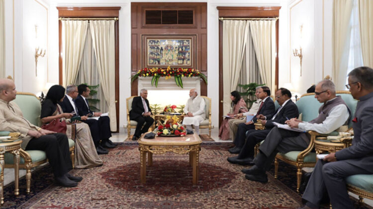 ന്യൂഡൽഹി: പ്രധാനമന്ത്രി നരേന്ദ്രമോദിയുമായി കൂടിക്കാഴ്ച നടത്തി ശ്രീലങ്കൻ പ്രസിഡന്റ് റനിൽ വിക്രമസിംഗെ. പ്രധാനമന്ത്രിയുടെ നേതൃത്വത്തിൽ ഇന്ത്യ വൻ മുന്നേറ്റം കൈവരിച്ചതായി അദ്ദേഹം വ്യക്തമാക്കി. തമിഴ്നാട് നാഗപട്ടണത്ത് നിന്നും ശ്രീലങ്കയിലെ കങ്കേശൻ തുറയിലേക്ക് ഫെറി സർവീസ് ആരംഭിക്കാൻ ഇരു രാജ്യങ്ങളും ധാരണയിലെത്തി .