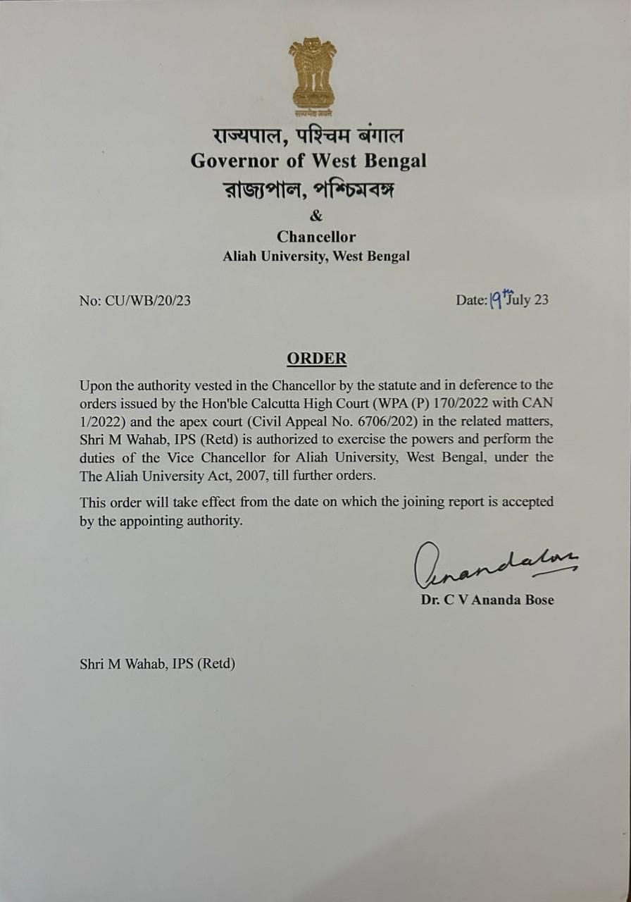 കൽക്കട്ടയിലെ 273 വര്ഷം പഴക്കമുള്ള ആലിയ യൂണിവേഴ്സിറ്റിയിൽ മലയാളിയായ കുറ്റാന്വേഷണ വിദഗ്ധൻ ഐപിഎസ് ഓഫീസർ എം വഹാബാണ് വിസി ആയി നിയമിക്കപ്പെട്ടത്. നേരത്തെ രബീന്ദ്രഭാരതി സർവകലാശാലാ വിസിയായി കർണാടക ഹൈക്കോടതി റിട്ട. ചീഫ് ജസ്റ്റിസ് ശുഭ്രകമൽ മുഖർജിയെ ഗവർണർ നിയമിച്ചിരുന്നു. ഇതോടെ പശ്ചിമ ബംഗാളിലെ കുത്തഴിഞ്ഞ വിദ്യാഭ്യാസ രംഗം നന്നാക്കിയെടുക്കാനുള്ള ഗവർണറുടെ നീക്കങ്ങളുടെ ഗതിവേഗം വർധിച്ചിരിക്കുകയാണ്.