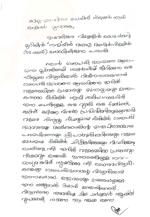 കോട്ടയം എൻഎസ്എസിലെ കുട്ടികളോട് ഗണപതിയുടെ തല പോയി ആനയുടെ തല വെച്ചതിന് പിന്നിലെ കഥ പറഞ്ഞുകൊടുത്തെന്ന് പറയുകയും തുടർന്നുള്ള ഫേസ്ബുക്ക് കുറിപ്പിൽ ഹൈന്ദവ ദേവതയെ ചേർത്ത് അശ്ലീല പരാമർശം നടത്തുകയുമായിരുന്നു. ഒരേസമയം പോസ്റ്റിലൂടെ ഹിന്ദു വിശ്വാസത്തെയും നായർ സമാജത്തെയും ഇയാൾ ആക്രമിക്കുകയാണ് ചെയ്തത്. ഇതിനെതിരെയാണ് വിശ്വഹിന്ദു പരിഷത്ത് രംഗത്ത് വന്നിരിക്കുന്നത്.