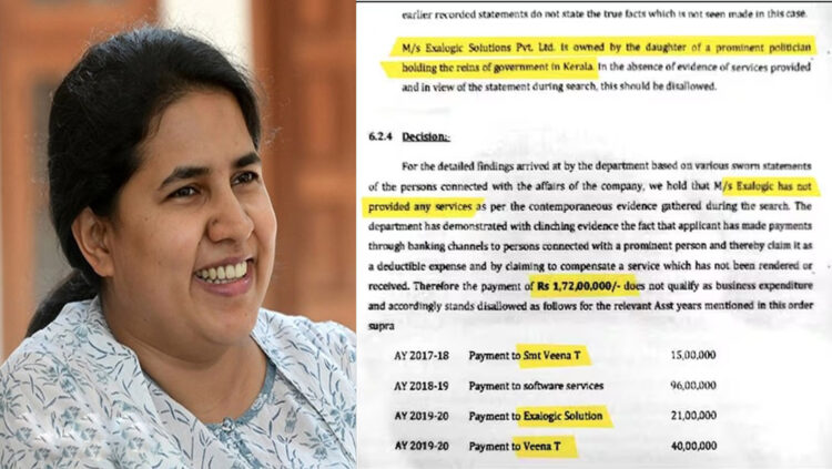 2017-20 കാലയളവില് മൊത്തം 1.72 കോടി രൂപയാണ് വീണയ്ക്കും എക്സാലോജിക്കിനുമായി ലഭിച്ചതെന്നും ഇതു നിയമവിരുദ്ധ പണമിടപാടാണെന്നും ആദായനികുതി വകുപ്പ് വാദിച്ചു. ലഭിക്കാതിരുന്ന സേവനങ്ങള്ക്കാണ് പണം നല്കിയതെന്ന് ശക്തമായ തെളിവുകളുടെ അടിസ്ഥാനത്തില് സ്ഥാപിക്കാന് ആദായനികുതി വകുപ്പിനു കഴിഞ്ഞെന്ന് സെറ്റില്മെന്റ് ബോര്ഡ് ബെഞ്ച് വ്യക്തമാക്കി.വീണയ്ക്കും കമ്പനിക്കും നല്കിയ പണം നിയമവിരുദ്ധ ഇടപാടിന്റെ ഗണത്തില്പെടുത്തണമെന്ന ആദായനികുതി വകുപ്പിന്റെ വാദം ബെഞ്ച് അംഗീകരിച്ചു.