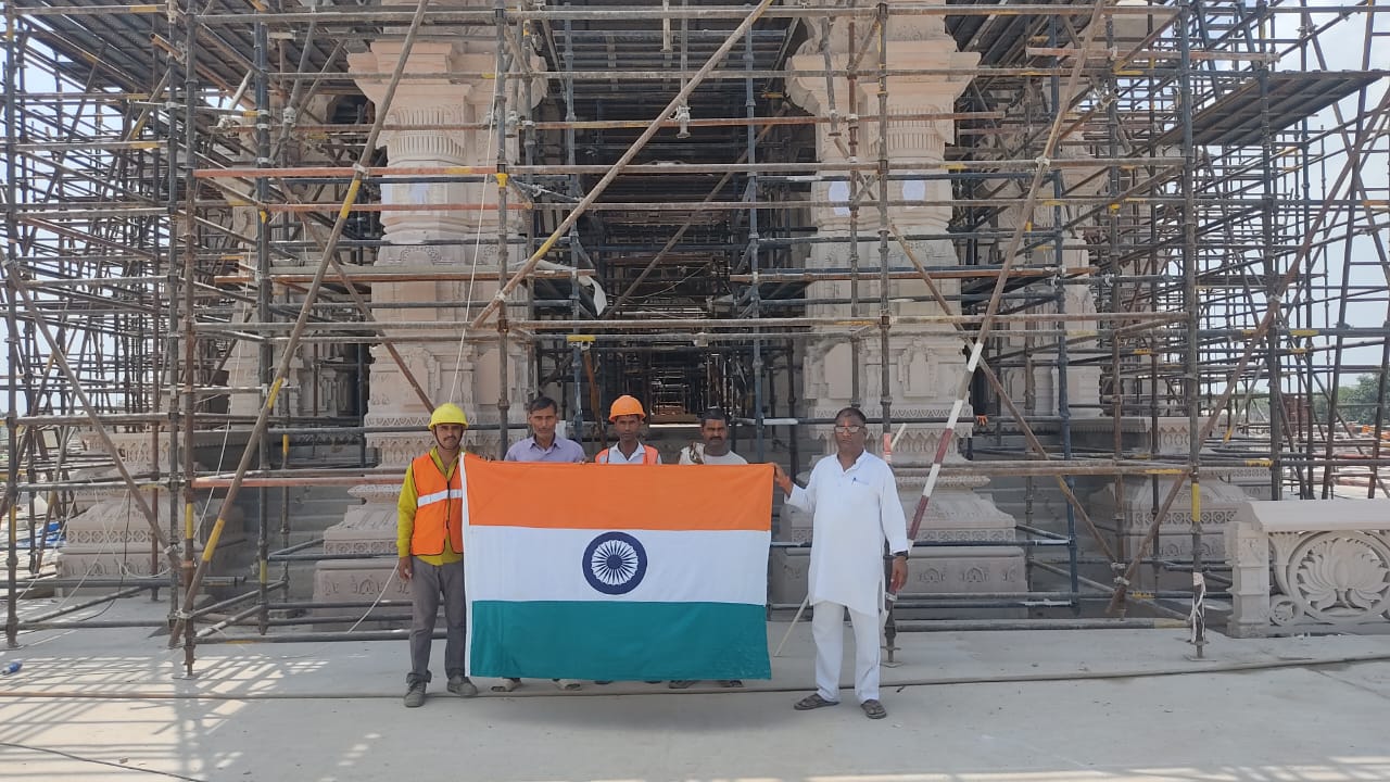 ത്രിവർണ്ണ പതാക ഉയർത്തി മധുരം വിതരണം ചെയ്ത് ശ്രീരാമജന്മഭൂമി ക്ഷേത്ര നിർമ്മാണ തൊഴിലാളികൾ; ദേശഭക്തി തുളുമ്പുന്ന മുദ്രാവാക്യങ്ങൾ കൊണ്ട് മുഖരിതമായി അയോദ്ധ്യ