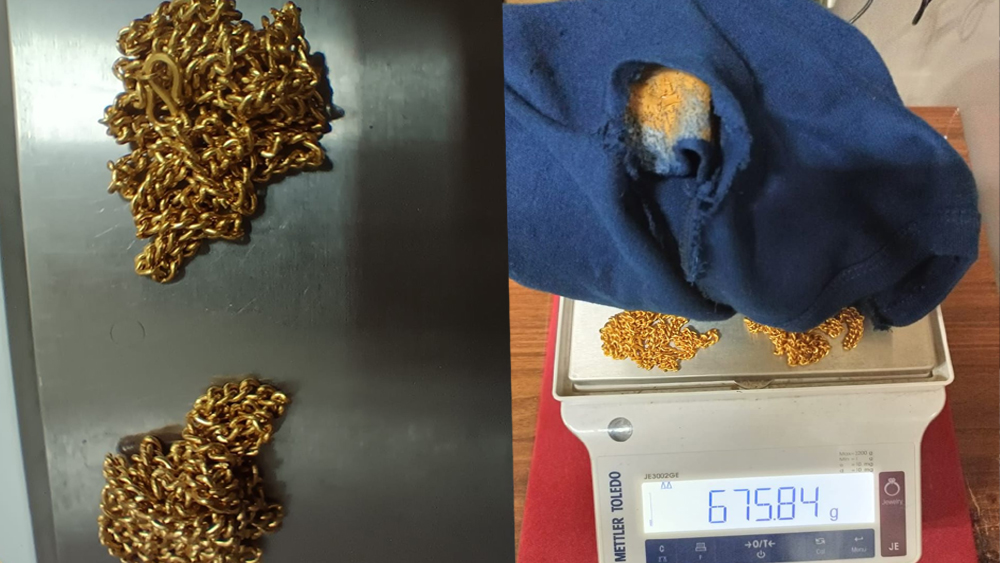 സ്വർണം മറച്ച് വെച്ചിരിക്കുന്നത് മനസിലാകാതിരിക്കാൻ തുണിത്തിന് മുകളിൽ തുണി തുന്നിവെച്ചു. സംശയം തോന്നി കൂടുതൽ പരിശോധിച്ചപ്പോഴാണ് സോക്‌സിനകത്ത് ഒളിപ്പിച്ച നിലയിൽ രണ്ട് സ്വർണ ചെയിനുകൾ കൂടി കസ്റ്റംസ് കണ്ടെടുത്തത്.