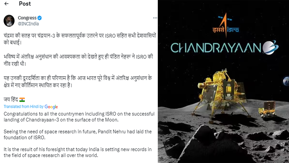 ചന്ദ്രയാൻ ദൗത്യത്തിന് അഭിനന്ദനം അറിയിച്ച് കോൺഗ്രസ് പങ്കുവെച്ച പോസ്റ്റിൽ നെഹ്‌റുവിന്റെ ദീർഘവീക്ഷണമാണ് രാജ്യത്തിന് ചന്ദ്രയാനിൽ ദൗത്യത്തിൽ ശക്തിപകർന്നതെന്നാണ് വാദം. രാജ്യത്തുണ്ടാകുന്ന നേട്ടങ്ങളെ നെഹ്‌റുവിലൂടെ സ്വന്തം കീശയിലാക്കാൻ ശ്രമിക്കുന്ന കോൺഗ്രസ്, കോട്ടങ്ങളെ മറ്റുള്ളവരുടെ തലയിൽ കെട്ടിവെക്കുകയുമാണ് ചെയ്യുന്നത്.
