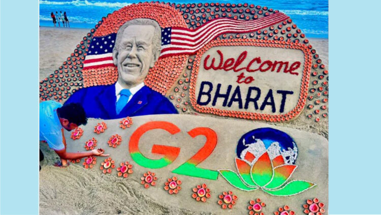 അമേരിക്കൻ പ്രസിഡന്റ് ജോ ബൈഡൻ ഭാരതത്തിലേക്ക് എത്തികൊണ്ടിരിക്കുന്ന വേളയിൽ മണലിൽ 2,000 ചിരാതുകളാൽ തീർത്ത അദ്ദേഹത്തിന്റെ ചിത്രത്തോടെ ഭാരതത്തിലേക്ക് സ്വീകരിച്ചിരിക്കുകയാണ് പ്രമുഖ സാൻഡ് ആർട്ടിസ്റ്റ് സുദർശൻ പട്‌നായിക്. സാമൂഹ മാദ്ധ്യമമായ എക്‌സിലൂടെ പങ്കുവെച്ച ചിത്രത്തിന് നിമിഷ നേരംകൊണ്ട് മികച്ച പ്രതികരണങ്ങളാണ് നേടാൻ സാധിച്ചത്. ‘വെൽക്കം ടു ഭാരത്’ എന്ന വാക്കുകളും ചിരാതുകൾ കൊണ്ട് തീർത്തിരിക്കുന്നത് നമുക്ക് കാണാം. ഇതിനുപുറമെ മണലിൽ തീർത്ത ജോ ബൈഡന്റെ ചിത്രവും അതിനു പിന്നിലായി ചിരാതുകൾ അടുക്കിവെച്ച് അമേരിക്കൻ പതാകയുടെ നിർമിതിയും കാണാം.
