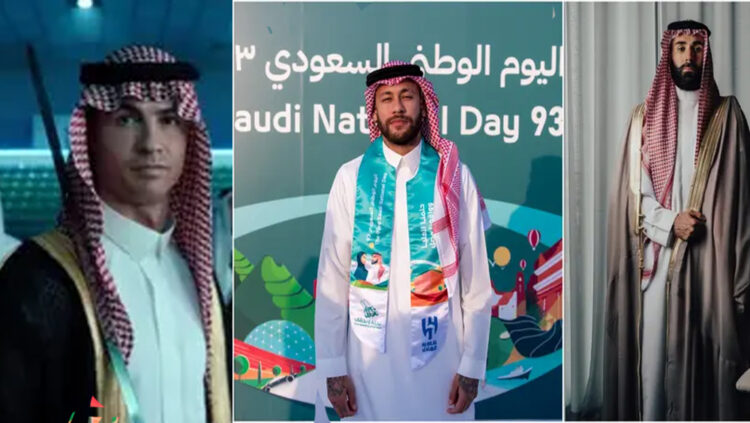 സൗദി ദേശീയദിനാഘോഷത്തിൽ തിളങ്ങി നെയ്മറും കരീം ബെൻസേമയും റൊണാൾഡോയും. അറേബ്യൻ പാരമ്പര്യ വേഷമണിഞ്ഞും വാളേന്തിയുമാണ് താരങ്ങൾ ദേശീയദിനാഘോഷത്തിൽ പങ്കുചേർന്നത്. മൂവരുടെയും ചിത്രങ്ങൾ ഇപ്പോൾ സമൂഹമാദ്ധ്യമങ്ങളിൽ വൈറലാണ്.