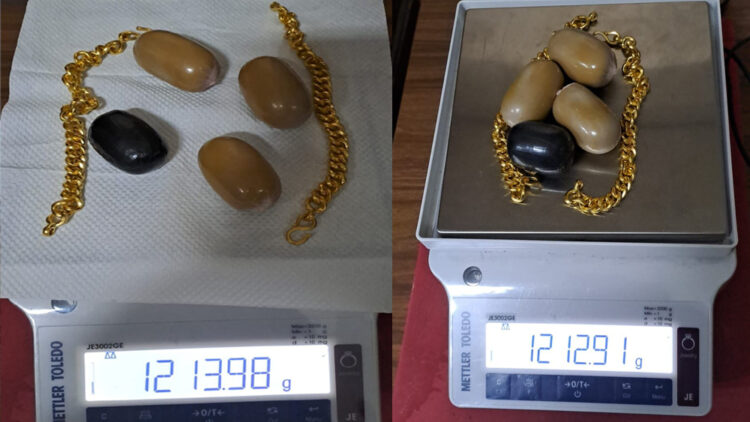 ദുബായിൽ നിന്നും വന്ന മലപ്പുറം സ്വദേശി ഷംനാസിന്റെ നടത്തത്തിൽ സംശയം തോന്നി ഷൂസ് അഴിപ്പിച്ചപ്പോൾ അതിൽ നിന്നും 175 ഗ്രാം വരുന്ന രണ്ട് സ്വർണ ചെയിനുകളാണ് ആദ്യം കണ്ടെത്തിയത്. തുടർന്ന് കൂടുതൽ പരിശോധിച്ചപ്പോഴാണ് മലദ്വാരത്തിനകത്ത് നാല്ഗുളികകളുടെ രൂപത്തിലൊളിപ്പിച്ച 1,038 ഗ്രാം സ്വർണം കൂടി കണ്ടെടുത്തത്.