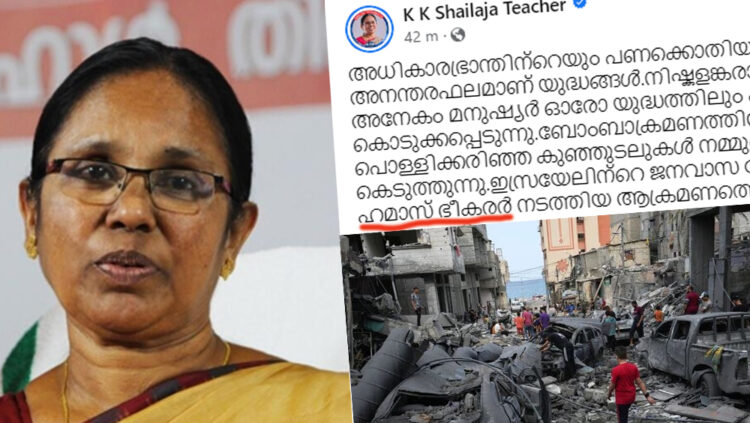 തിരുവനന്തപുരം: ഇസ്രായേലിന്റെ ജനവാസ മേഖലയിൽ ഹമാസ് ഭീകരർ നടത്തിയ ആക്രമണം ഞെട്ടിപ്പിക്കുന്നതാണെന്നും സിപിഎം നേതാവ് കെ.കെ ഷൈലജ. ഇസ്രായേലിൽ അക്രമം അഴിച്ചു വിട്ടത് ഇസ്ലാമിക ഭീകരരാണെന്ന് സിപിഎം പറയാൻ മടിക്കുമ്പോഴാണ് ഹമാസ് ഭീകരരാണ് ഇസ്രായേലിൽ മനുഷ്യരെ കൊന്നൊടുക്കുന്നതെന്ന് കെ.കെ ഷൈലജ തുറന്നു പറഞ്ഞിരിക്കുന്നത്. രണ്ട് ഭാഗവും ബാലൻസ് ചെയ്തുകൊണ്ടാണ് സിപിഎം നേതാവിന്റെ പോസ്റ്റ്. ‘ഹമാസ് ഭീകരർ എന്നുള്ളത് തിരുത്തരുത്’, ‘നൈസ് ആയിട്ട് രണ്ട് വള്ളത്തിലും ചവിട്ടി’, ‘ഹമാസ് ഭീകരര് എന്നുള്ള വാക്ക് നാളെയും കാണണം’ എന്നിങ്ങനെ ഒരു വിഭാഗം പോസ്റ്റിന് കമന്റ് ചെയ്യുമ്പോൾ, ഹമാസിനെ പോരാളികൾ എന്ന് വിളിക്കണമെന്ന് ആവശ്യപ്പെട്ട് ഇസ്ലാമിസ്റ്റുകളും രംഗത്തു വന്നിട്ടുണ്ട്.