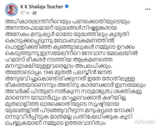 കെ.കെ ഷൈലജയുടെ ഫേസ്ബുക്ക് പോസ്റ്റ്,