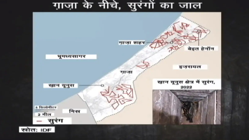 500 കിലോമീറ്റർ നീളമുള്ളതാണ് ഗാസയിലെ തുരങ്ക ശൃംഖല. 2021-ൽ ഈ തുരങ്കം ഇസ്രായേൽ പ്രതിരോധ സേന തകർത്തിരുന്നു. കേവലം അഞ്ച് ശതമാനം മാത്രമാണ് ഐഡിഎഫിന് നശിപ്പിക്കാൻ സാധിച്ചതെന്ന് ഹമാസ് നേതാവ് യഹ്യ സിൻവാർ അവകാശപ്പെട്ടിരുന്നു. ഗാസ മുനമ്പിലെ സങ്കീർണമായ നെറ്റ്‌വർക്ക് ടണലിന്റെ ചിത്രങ്ങളാണ് താഴെ നൽകിയിരിക്കുന്നത്. ചുവപ്പ് നിറത്തിൽ അടയാളപ്പെടുത്തിയിരിക്കുന്നതാണ് ടണൽ ശൃംഖല.