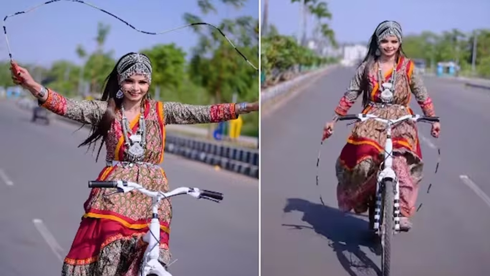 വള്ളിച്ചാട്ടം ചാടുമ്പോൾ മൂക്കും കുത്തി താഴെ വീഴും എന്നും പറഞ്ഞ് അമ്മമാർ ശകാരിച്ചിട്ടുള്ളതാവും ഒരുപക്ഷേ ഈ ദൃശ്യങ്ങൾ കാണുമ്പോൾ നിങ്ങൾക്ക് ഓർമ്മ വരിക. വീഡിയോയിൽ വള്ളിച്ചാട്ടം ചെയ്യുന്ന ഒരു പെൺകുട്ടിയാണ് താരം. എന്നാൽ അത് വെറുമൊരു വള്ളിച്ചാട്ടമല്ലെന്ന് മാത്രം. സൈക്കിളിൽ സവാരി നടത്തിയാണ് പെൺകുട്ടി വള്ളിച്ചാട്ടം നടത്തുന്നത്. കൈവിട്ട് സൈക്കിൾ ചവിട്ടുകയും അതേസമയം വള്ളിച്ചാട്ടം നടത്തുകയുമാണ് പെൺകുട്ടി. അവരുടെ പാരമ്പര്യ വസ്ത്രമായ ലഹങ്ക ധരിച്ചാണ് പെൺകുട്ടി സൈക്കിൾ ചവിട്ടുന്നത്. ‘ സ്കിപ്പിംഗ് ഇൻ മൈ സ്റ്റൈൽ ( വള്ളിച്ചാട്ടം എന്റെ ശൈലിയിൽ) എന്ന അടികുറിപ്പോടെയാണ് അവൾ സമൂഹ മാദ്ധ്യമത്തിൽ വീഡിയോ പങ്കുവച്ചിരിക്കുന്നത്.