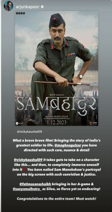 'എന്തൊരു ധീരമായ ചിത്രം'; സാം മനേക് ഷായായി വിസ്മയിപ്പിച്ച് വിക്കി കൗശൽ, പ്രശംസയുമായി അർജുൻ കപൂർ