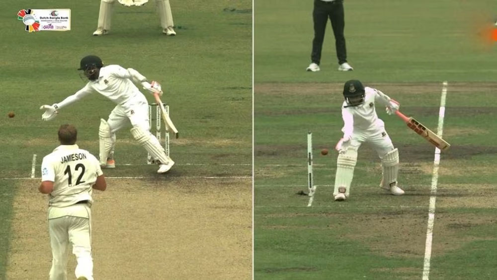 ന്യൂസീലന്ഡിനെതിരായ രണ്ടാം ക്രിക്കറ്റ് ടെസ്റ്റിന്റെ ഒന്നാം ദിനമായിരുന്നു വിചിത്രമായ പുറത്താകൽ. കൈല് ജാമിസണ് എറിഞ്ഞ 41-ാം ഓവറിലായിരുന്നു സംഭവം. ബംഗ്ലാദേശ് താരത്തിന്റെ ബാറ്റിൽ തട്ടി പന്ത് ഉയർന്നു. ഇത് വിക്കറ്റിലേക്ക് പോകുമെന്ന കരുതിയ മുഷ്ഫിഖറിന് പിഴച്ചു. ഇതു ശ്രദ്ധിക്കാതെ കൈകൊട്ട് ബോൾ തട്ടിയകറ്റി.