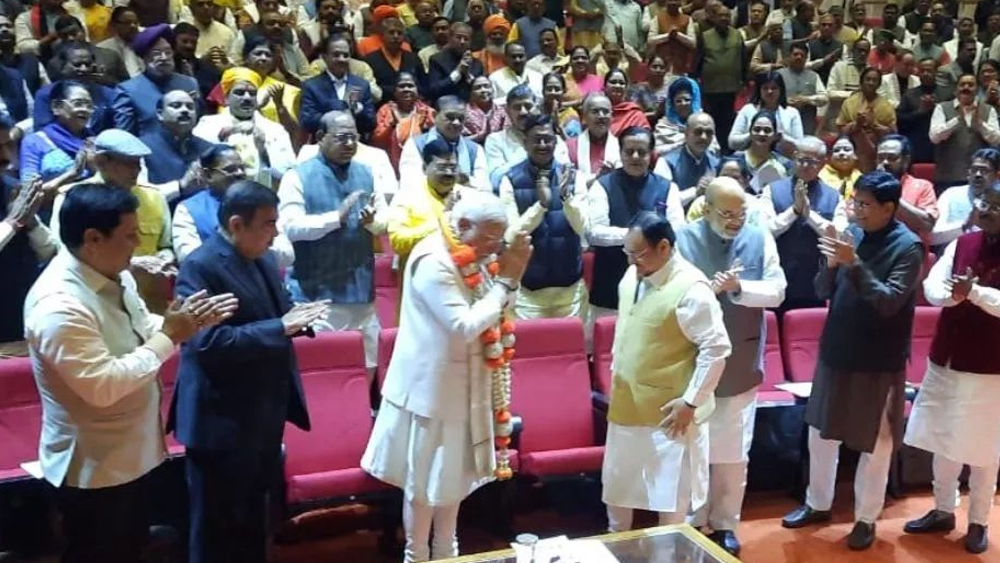ന്യൂഡൽഹി: സംസ്ഥാനങ്ങളിൽ ബിജെപി നേടിയ വിജയത്തിന് പിന്നാലെ നടന്ന പാർലമെന്ററി യോഗത്തിൽ പ്രധാനമന്ത്രി നരേന്ദ്രമോദിക്ക് ഉജ്ജ്വല സ്വീകരണം നൽകി ബിജെപി നേതാക്കൾ. ബിജെപി ദേശീയ അദ്ധ്യക്ഷൻ ജെപി നദ്ദ പ്രധാനമന്ത്രിയെ സ്വാഗതം ചെയ്തു. ‘മോദി ജി കാ സ്വാഗത് ഹേ’എന്ന മുദ്രാവാക്യങ്ങളോടൊപ്പമാണ് ബിജെപി നേതാക്കൾ പ്രധാനമന്ത്രിയെ വരവേറ്റത്.