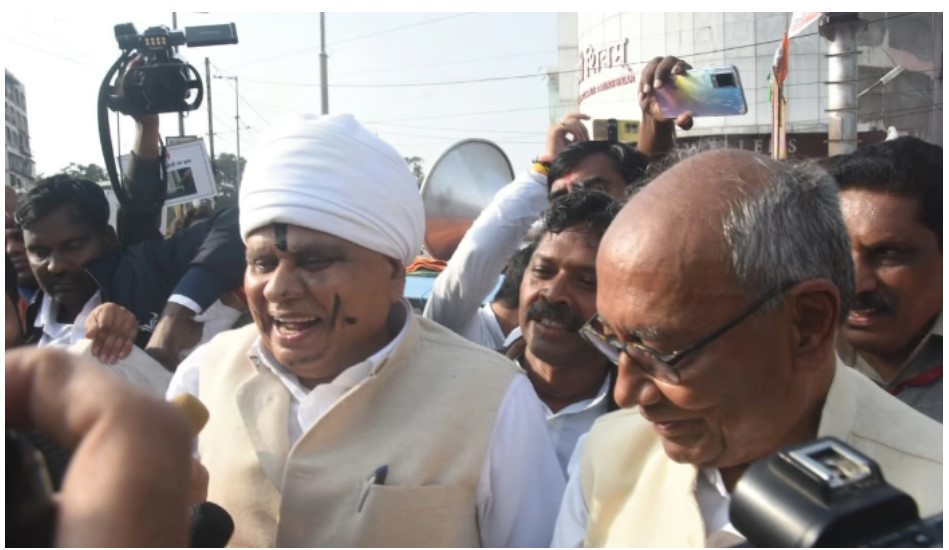 ഇതിനെത്തുടര്ന്നാണ് വാഗ്‌ദാനം ചെയ്‌തതുപോലെ, പാർട്ടി നേതാക്കളുടെയും പ്രവർത്തകരുടെയും മുൻ മുഖ്യമന്ത്രി ദിഗ്വിജയ് സിംഗിന്റെയും ഒപ്പം ഭന്ദർ എംഎൽഎ ഫൂൽ സിംഗ് ബരയ്യ മുഖത്ത് കറുത്ത പാട് പതിപ്പിച്ചാണ് രാജ്ഭവന് മുന്നിൽ പ്രത്യക്ഷപ്പെട്ടത് . മുതിർന്ന കോൺഗ്രസ് നേതാവ് ദിഗ്വിജയ് സിംഗിനോടും മുഖത്ത് കറുത്ത ചായം തേയ്‌ക്കാൻ ബരയ്യ അഭ്യർത്ഥിച്ചെങ്കിലും സിംഗ് അത് നിരസിച്ചു. രണ്ട് പേർക്കുമൊപ്പം മറ്റ് പാർട്ടി അംഗങ്ങളും പുഞ്ചിരിക്കുന്നത് കാണാമായിരുന്നു. സംസ്ഥാനത്ത് പോസ്റ്റൽ ബാലറ്റിൽ കോൺഗ്രസ് മുന്നിലാണെന്നും അതിനാൽ താൻ വാക്ക് പാലിക്കില്ലെന്നുമാണ് ദിഗ്വിജയ് സിംഗിന്റെ വാദം.