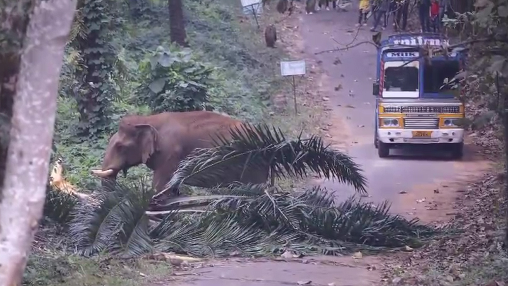 എണ്ണപ്പന റോഡിലേക്ക് തള്ളിയിടുകയും റോഡിൽ നിന്ന് മാറാതെ കുറുകെ നിൽക്കുകയും ചെയ്തു. ആന മാറുന്നതും കാത്ത് നിരവധി വാഹനങ്ങളാണ് റോഡിൽ നിർത്തിയിട്ടിരുന്നത്.