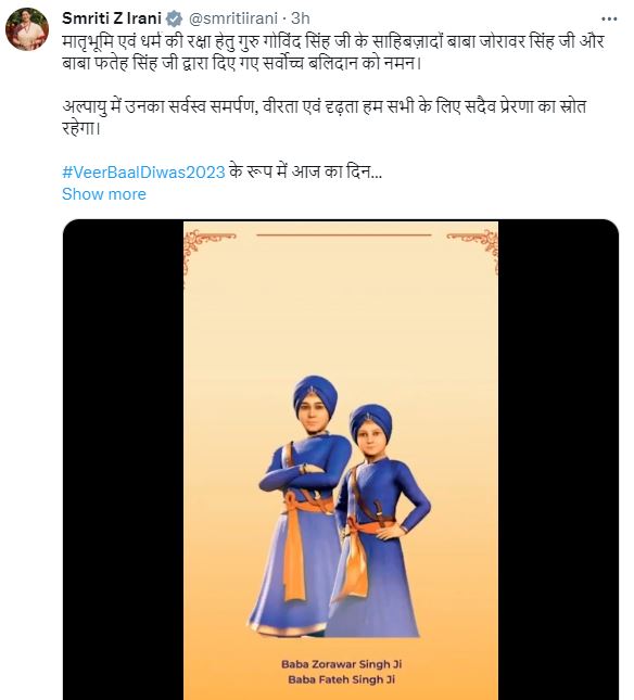 ” #VeerBaalDiwas2023 ഇന്ന് സാഹിബ്സാദാസിന്റെ ധീരതയുടെ സ്മരണയുടെ ദിനമാണ്. മാതൃരാജ്യത്തിന്റെയും മതത്തിന്റെയും സംരക്ഷണത്തിനായി ഗുരു ഗോവിന്ദ് സിംഗ് ജിയുടെ സാഹിബ്സാദാസ് ബാബ സോരാവർ സിംഗ് ജിയും ബാബ ഫത്തേ സിംഗ് ജിയും നടത്തിയ പരമോന്നത ത്യാഗത്തിന് അഭിവാദ്യം. അദ്ദേഹത്തിന്റെ ഹ്രസ്വമായ ജീവിതത്തിൽ അദ്ദേഹത്തിന്റെ സമർപ്പണവും ധൈര്യവും സ്ഥിരോത്സാഹവും നമുക്കെല്ലാവർക്കും എന്നും പ്രചോദനമായിരിക്കും”. കേന്ദ്ര മന്ത്രി സ്മൃതി ഇറാനി എക്സിൽ കുറിച്ചു.