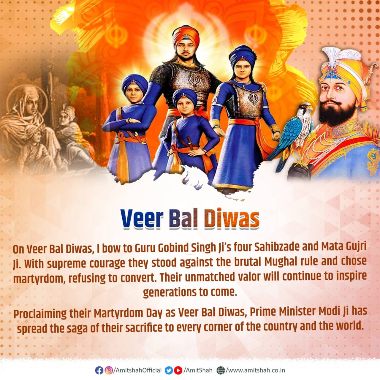 “വീർ ബാൽ ദിനത്തിൽ, ഞാൻ ഗുരു ഗോവിന്ദ് സിംഗ് ജിയുടെ നാല് സാഹിബ്സാദമാരെയും മാതാ ഗുജ്രി ജിയെയും നമിക്കുന്നു. പരമമായ ധൈര്യത്തോടെ അവർ ക്രൂരമായ മുഗൾ ഭരണത്തിനെതിരെ നിലകൊള്ളുകയും മതം മാറാൻ വിസമ്മതിക്കുകയും രക്തസാക്ഷിത്വം തിരഞ്ഞെടുക്കുകയും ചെയ്തു. അവരുടെ സമാനതകളില്ലാത്ത വീര്യം വരും തലമുറകളെ പ്രചോദിപ്പിക്കും. അവരുടെ രക്തസാക്ഷിത്വ ദിനം വീർബൽ ദിവസായി പ്രഖ്യാപിച്ചുകൊണ്ട്, പ്രധാനമന്ത്രി മോദി ജി അവരുടെ ത്യാഗത്തിന്റെ കഥ രാജ്യത്തിന്റെയും ലോകത്തിന്റെയും എല്ലാ കോണുകളിലേക്കും വ്യാപിപ്പിച്ചു.” അമിത് ഷാ എക്സിൽ കുറിച്ചു.