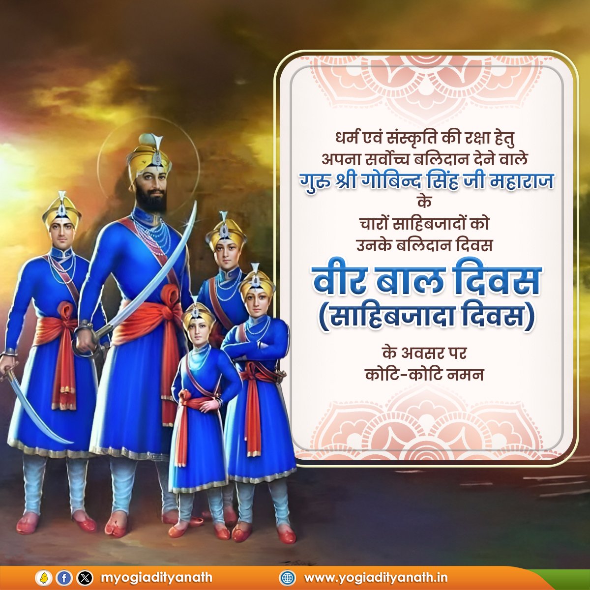 “ഗുരു ശ്രീ ഗോബിന്ദ് സിംഗ് ജി മഹാരാജിന്റെ നാല് സാഹിബ്സാ ദമാർക്ക് അവരുടെ രക്തസാക്ഷിത്വ ദിനമായ വീർ ബാൽ ദിവസ് (സാഹിബ്സാദ ദിനം) ആദരാഞ്ജലികൾ. നാല് സാഹിബ്സാദമാരുടെ പരമമായ ത്യാഗം മാതൃരാജ്യത്തെയും നമ്മുടെ മതത്തെയും സംരക്ഷിക്കാൻ നമുക്കെല്ലാവർക്കും എപ്പോഴും പ്രചോദനം നൽകും.” ഉത്തർ പ്രദേശ് മുഖ്യമന്ത്രി യോഗി ആദിത്യ നാഥ് എക്സിൽ കുറിച്ചു.