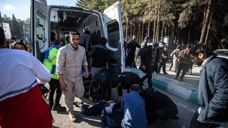 റെവല്യൂഷനറി ഗാർഡ് മുൻ കമാൻഡർ ഖാസിം സുലൈമാനിയുടെ രക്തസാക്ഷിത്വ വാർഷികത്തിനിടെയാണ് സ്ഫോടനം ഉണ്ടായത്. രക്തസാക്ഷി വാർഷികവുമായിബന്ധപ്പെട്ട ചടങ്ങിൽ പങ്കെടുക്കാൻ ആയിരങ്ങൾ തടിച്ചുകൂടിയ ഘട്ടത്തിലാണ് ഭീകരർ റിമോട്ട് ഉപയോഗിച്ച് സ്ഫോടനം നടത്തിയത്. സ്മാരകത്തിൽനിന്ന് 700 മീറ്റർ അകലെയായിരുന്നു ആദ്യ സ്ഫോടനം. 13 മിനിറ്റിന് ശേഷം രണ്ടാമത്തെ സ്ഫോടനം നടന്നു. ആക്രമണത്തിൽ 200-ലധികം പേർക്കാണ് പരിക്കേറ്റത്.