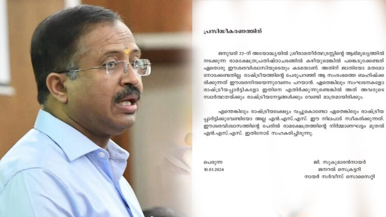 തിരുവനന്തപുരം: എൻഎസ്എസിന് പിന്തുണയുമായി കേന്ദ്രമന്ത്രി വി മുരളീധരൻ. കോൺഗ്രസ് – കമ്യൂണിസ്റ്റ് കൂട്ടുകെട്ടിനേറ്റ പ്രഹരമാണ് പ്രാണ പ്രതിഷ്ഠാ ചടങ്ങിനെ കുറിച്ചുള്ള എൻഎസ്എസിന്റെ നിലപാടെന്ന് കേന്ദ്രമന്ത്രി പറഞ്ഞു. പ്രാണ പ്രതിഷ്ഠാ ചടങ്ങ് ബഹിഷ്‌കരിക്കുന്നത് ഈശ്വരനിന്ദയും, സ്വാർത്ഥ താത്പര്യത്തിനും രാഷ്‌ട്രീയ നേട്ടങ്ങൾക്കും വേണ്ടിയാണെന്നുമായിരുന്നു എൻഎസ്എസിന്റെ പ്രതികരണം.