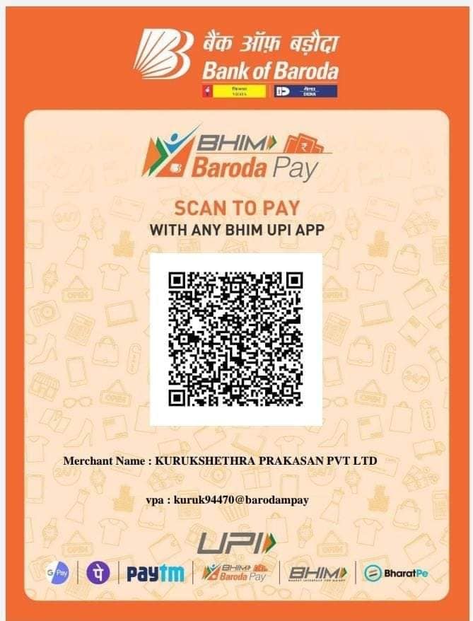 പുസ്തകം ആവശ്യമുളളവർ ഇതോടൊപ്പമുള്ള QR code സ്കാൻ ചെയ്ത് Google Pay ചെയ്ത്, പണമടച്ചതിന്റെ സ്ക്രീൻ ഷോട്ട് , പുസ്തകം ലഭിക്കേണ്ട വിലാസം, പിൻകോഡ് , ഫോൺ നമ്പർ എന്നിവ കുരുക്ഷേത്ര ബുക്സിന്റെ 99952 14441 എന്ന മൊബൈലിലേക്ക് വാട്സാപ് ചെയ്താൽ മതിയാകും.