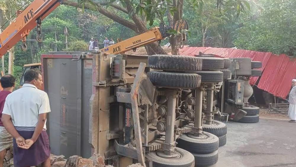 ടോറസ് ലോറി നിയന്ത്രണം വിട്ട് മറിഞ്ഞ് അപകടം; ഡ്രൈവർ രക്ഷപ്പെട്ടത് തലനാരിഴയ്ക്ക്