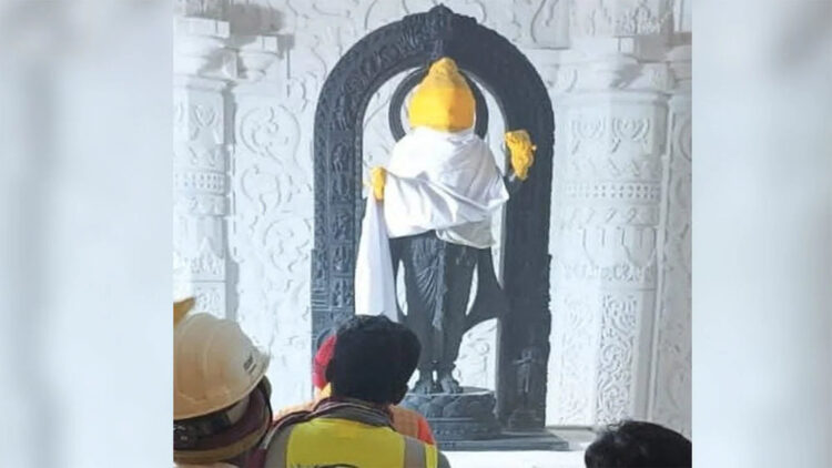 അയോദ്ധ്യ: അയോദ്ധ്യയിലെ രാമക്ഷേത്രത്തിനുള്ളിൽ സ്ഥാപിച്ച ശ്രീരാമവിഗ്രഹത്തിന്റെ ആദ്യ ചിത്രം പുറത്ത്. ബാലരൂപത്തിലുള്ള ശ്രീരാമഭഗവാന്റെ രൂപമാണ് കൃഷ്ണശിലയിൽ കൊത്തിയെടുത്തിരിക്കുന്നത്. വിഗ്രഹത്തിന്റെ മുഖവും ദേഹത്തിന്റെ പകുതിയോളവും തുണി ഉപയോഗിച്ച് മറച്ചിരിക്കുന്നതായും ഈ ചിത്രത്തിൽ കാണാനാകും.