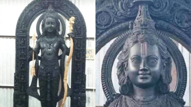 ലക്നൗ: അയോദ്ധ്യാ രാമക്ഷേത്രത്തിലെ ശ്രീകോവിലിനുള്ളിൽ പ്രതിഷ്ഠിച്ച രാമവി​ഗ്ര​ഹത്തിന്റെ പൂർണ ചിത്രം പുറത്ത്. സ്വർണ അമ്പും വില്ലുമേന്തി നിൽക്കുന്ന ഭ​ഗവാൻ രാമന്റെ ബാലരൂപമാണ് വി​ഗ്രഹത്തിൽ കൊത്തിയെടുത്തിരിക്കുന്നത്. കൃഷ്ണശിലയിൽ കൊത്തിയെടുത്തിരിക്കുന്ന വിഗ്രഹത്തിന്റെ മുഖവും അഞ്ച് വയസ് പ്രായം തോന്നിക്കുന്ന രൂപവും ചിത്രത്തിൽ കാണാനാകും.
