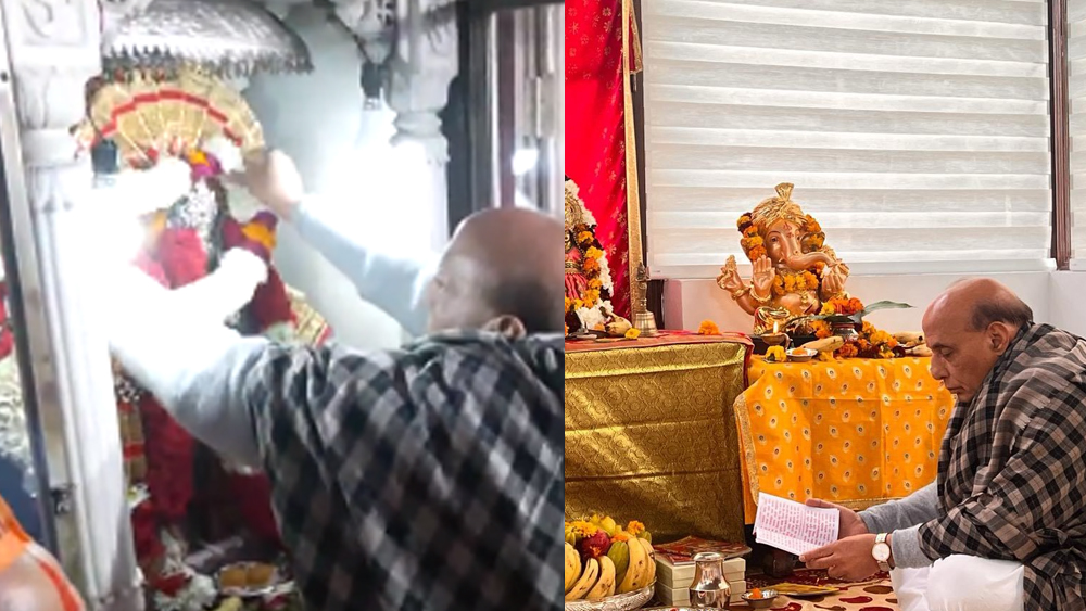 Defence Minister Rajnath Singh performs pooja at his residence ahead of the Pran Pratishtha ceremony at Ram Temple in Ayodhya. pic.twitter.com/Kw3Fl3TV04