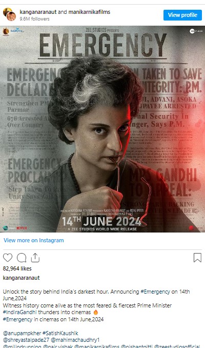 കങ്കണാ റണാവത്ത് പ്രധാനവേഷത്തിലെത്തുന്ന ചിത്രമായ എമർജൻസിയുടെ റിലീസ് ഡേറ്റ് പുറത്ത്. ചിത്രം ജൂൺ 14 നാണ് തീയേറ്ററിലെത്തുക. ഇന്ദിര പ്രിയദർശിനി ഇന്ത്യയിൽ അടിയന്തരാവസ്ഥ പ്രഖ്യാപിച്ച് ജനാധിപത്യത്തെ അട്ടിമറിച്ച കാലഘട്ടത്തെ വിശദീകരിക്കുന്നതാണ് ചിത്രം. ട്വിറ്ററിലൂടെ കങ്കണ തന്നെയാണ് റിലീസ് ഡേറ്റ് പ്രഖ്യാപിച്ചിരിക്കുന്നത്.