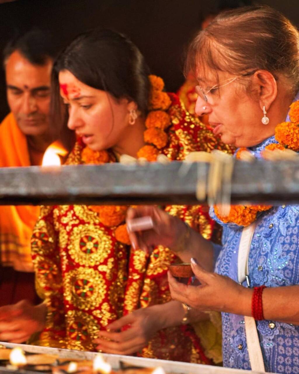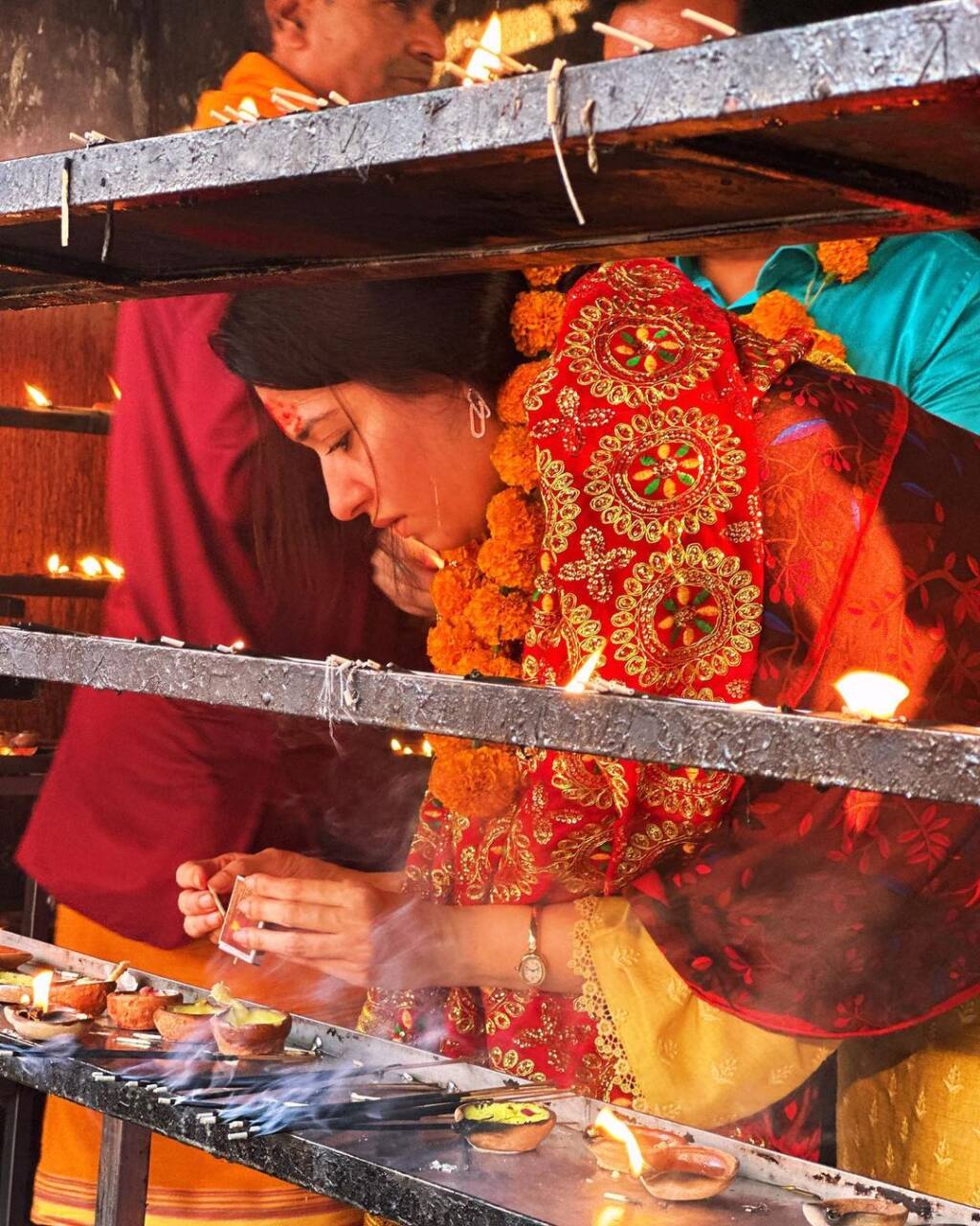 കഴുത്തിൽ പൂമാലയും നെറ്റിയിൽ തിലകവുമണിഞ്ഞ് ക്ഷേത്രത്തിലെ വിളക്കുകൾ തെളിയിക്കുന്നതിന്റെ ചിത്രങ്ങളും താരം പങ്കുവച്ചു.
