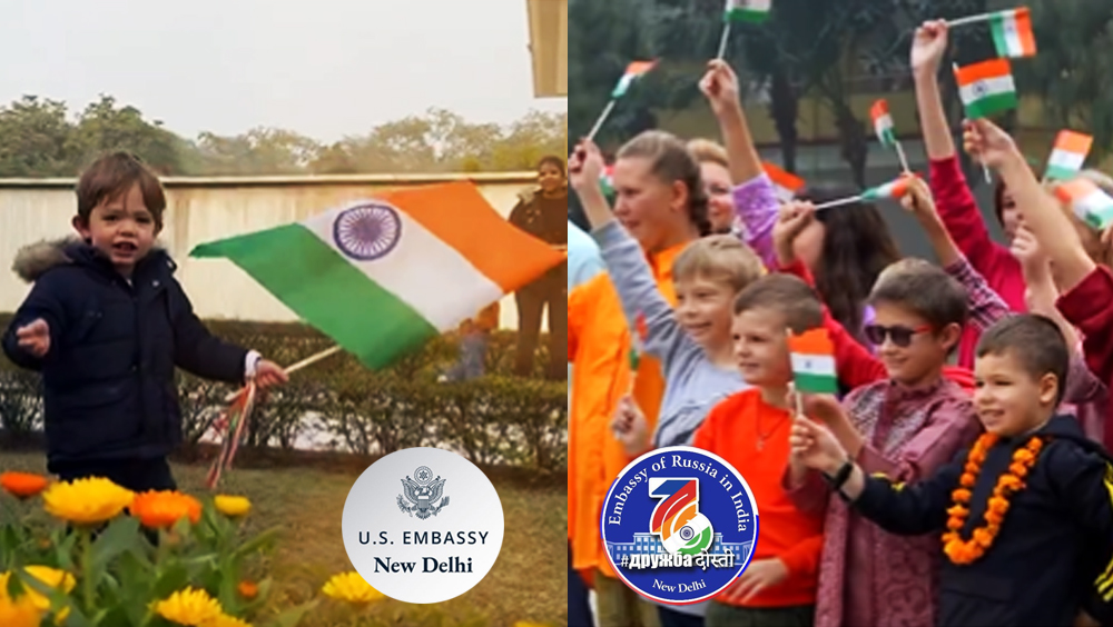 ന്യൂഡൽഹി: ഭാരത്തിന്റെ 75-ാം റിപ്പബ്ലിക് ദിനം ആഘോഷമാക്കാൻ മത്സരിച്ച് ഇന്ത്യയിലെ റഷ്യൻ, അമേരിക്കൻ എംബസികൾ. ഇന്ത്യൻ ഗാനങ്ങൾക്ക് എംബസി ഉദ്യോഗസ്ഥരും അവരുടെ കുടുംബങ്ങളും നൃത്തം ചെയ്യുന്ന വീഡിയോകളാണ് ഇരുരാജ്യങ്ങളുടെയും എംബസികൾ പങ്കുവച്ചിരിക്കുന്നത്. വീഡിയോകൾ ഇതിനോടകം സമൂഹമാദ്ധ്യമങ്ങളിൽ വൈറലായിട്ടുണ്ട്.