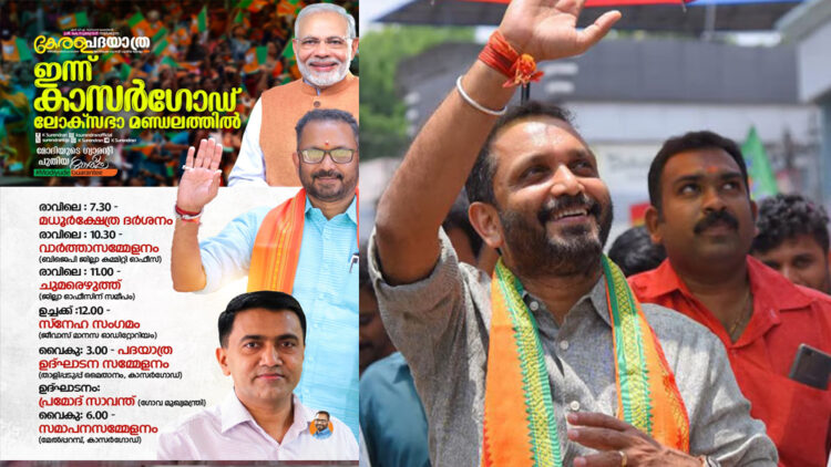 തിരുവനന്തപുരം: കേന്ദ്രസർക്കാരിന്റെ വിവിധ പദ്ധതികൾ സംസ്ഥാനത്തെ ജനങ്ങളിലേക്ക് എത്തിക്കുന്നതിനായി ബിജെപി സംസ്ഥാന അദ്ധ്യക്ഷൻ കെ സുരേന്ദ്രൻ നയിക്കുന്ന കേരള പദയാത്ര ഇന്ന് കാസർകോട് ആരംഭിക്കും. വൈകിട്ട് മൂന്നിന് താളിപ്പടത്ത് മൈതാനത്തിൽ നടക്കുന്ന ചടങ്ങ് ഗോവ മുഖ്യമന്ത്രി പ്രമോദ് സാവന്ത് ഉദ്ഘാടനം ചെയ്യും. രാവിലെ കാസർകോട് മധൂർ ക്ഷേത്രത്തിൽ ദർശനം നടത്തിയ ശേഷം കേരള പദയാത്രയോടനുബന്ധിച്ച് ജില്ലയിലെ മറ്റ് പരിപാടികൾക്ക് കെ സുരേന്ദ്രൻ തുടക്കം കുറിക്കും. ആദ്യ ദിവസത്തെ പദയാത്ര മേൽപ്പറമ്പിൽ സമാപിക്കും.