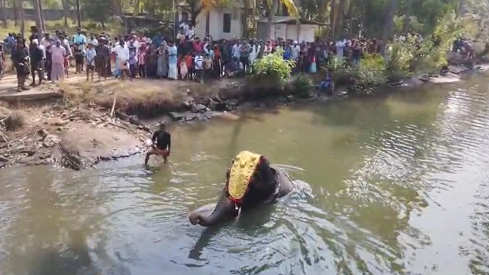 നേർച്ച പിന്നെ, ആദ്യമൊന്ന് നീരാടട്ടെ; കൊടിയേറ്റത്തിനായി വന്ന ആന പൊടുന്നനെ കനാലിൽ ഇറങ്ങി നീരാടിയത് മണിക്കൂറുകളോളം; രസകരമായ വീഡിയോ പകർത്തി നാട്ടുകാർ