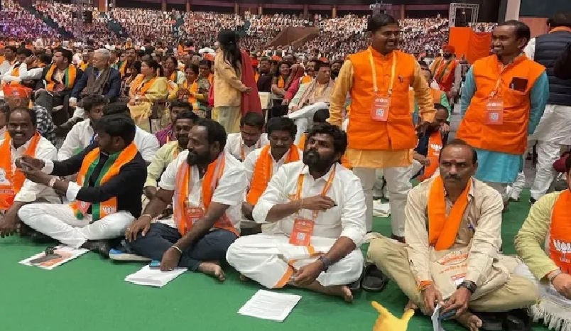 പ്രത്യേക കസേര വേണ്ട : ഡൽഹിയിലെ പാർട്ടി കൺവെൻഷനിൽ ബിജെപി പ്രവർത്തകർക്കൊപ്പം നിലത്തിരുന്ന് കെ അണ്ണാമലൈ