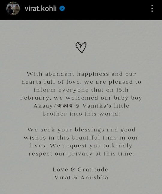 “വലിയ സന്തോഷത്തോടെയും ഹൃദയം നിറഞ്ഞ സ്നേഹത്തോടെയും ഞങ്ങൾ അറിയക്കട്ടെ, ഫെബ്രുവരി 15 ന്, ഞങ്ങളുടെ ആൺകുഞ്ഞ് ജനിച്ചു. വാമികയുടെ കുഞ്ഞു സഹോദരൻ അകായ്ക്ക് ഞങ്ങളുടെ ലോകത്തേക്ക് സ്വാഗതം. ഇക്കാര്യം നിങ്ങളെ അറിയിക്കുന്നതിൽ ഞങ്ങൾക്ക് ഒരുപാട് സന്തോഷമുണ്ട്. ഞങ്ങളുടെ ജീവിതത്തിലെ മനോഹരമായ ഈ നിമിഷത്തിൽ നിങ്ങളുടെ അനുഗ്രഹങ്ങളും ആശംസകളും പ്രതീക്ഷിക്കുന്നു. ഈ സമയത്ത് ഞങ്ങളുടെ സ്വകാര്യതയെ ബഹുമാനിക്കണമെന്ന് നിങ്ങളോട് അഭ്യർത്ഥിക്കുന്നു”- എന്നാണ് കോലിയും അനുഷ്കയും ഇൻസ്റ്റാഗ്രാമിൽ പങ്കുവെച്ച കുറിപ്പിൽ പറയുന്നത്.