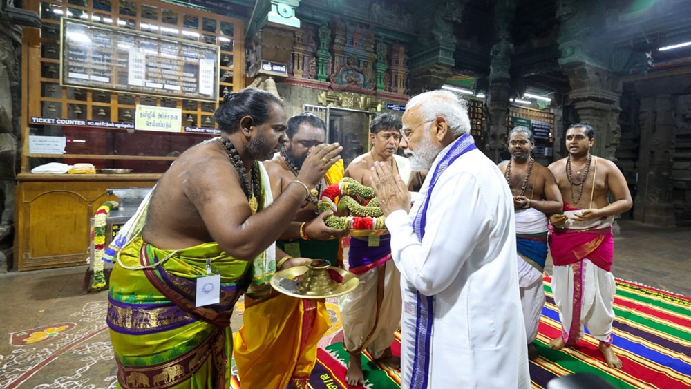 മധുരയിലെ പ്രശസ്തമായ മീനാക്ഷി അമ്മൻ ക്ഷേത്രത്തിൽ അദ്ദേഹം പ്രാർത്ഥനകൾ നടത്തിയിരുന്നു. ദ്വദിന തമിഴ്നാട് സന്ദർശനത്തിനെത്തിയ പ്രധാനമന്ത്രിക്ക് ഇന്നലെ ഊഷ്മളമായ വരവേൽപ്പായിരുന്നു ലഭിച്ചത്. 67 കിലോഗ്രാം തൂക്കമുള്ള മഞ്ഞൾമാലയാണ് അദ്ദേഹത്തിന് ഈറോഡ് സ്വദേശികൾ കാത്തുവച്ചിരുന്നത്. തുടർന്ന് എംഎസ്എംഇകൾക്കായി ടിവിഎസ് ഓപ്പൺ മൊബിലിറ്റി പ്ലാറ്റ്ഫോമിന്റെ ഉദ്ഘാടനവും അദ്ദേഹം നിർവഹിച്ചു.