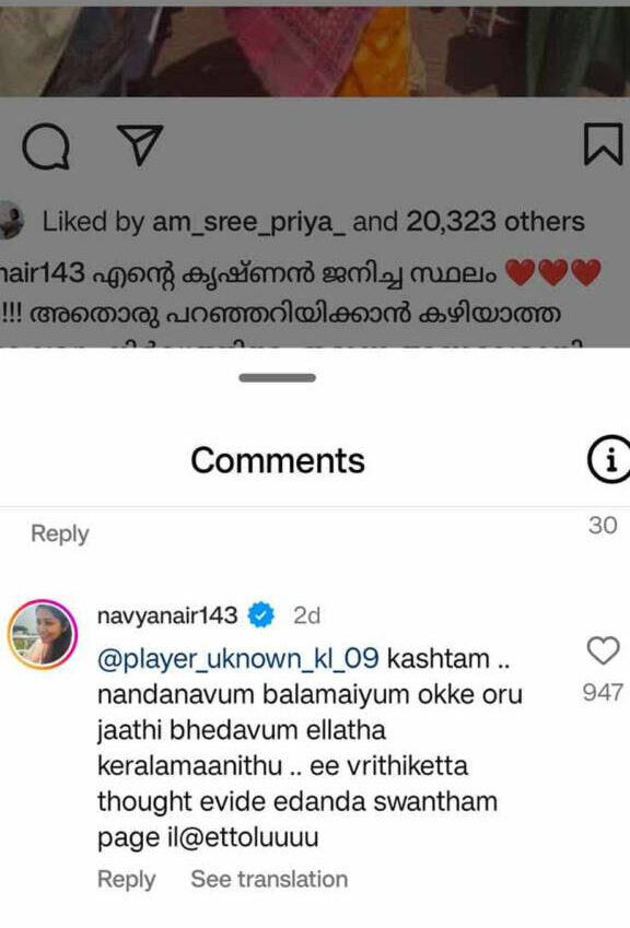 എന്നാൽ താരത്തിന്റെ ക്ഷേത്ര ദർശനത്തെ വിവാദമാക്കുകയാണ് പലരും. കൃഷ്ണൻ ജനിച്ച സ്ഥലമെന്ന് എങ്ങനെ പറയുമെന്നും അത് സങ്കൽപ്പം മാത്രമാണെന്നുമാണ് നവ്യയുടെ പോസ്റ്റിന് താഴെ വിമർശനമുയരുന്നത്. രാഷ്ട്രീയ വിമർശനങ്ങളും പോസ്റ്റിന് താഴെ നിറയുന്നുണ്ട്. എന്നാൽ അതിന് മറുപടിയുമായി നടി രംഗത്തെത്തി. ഇത്തരം ചിന്താഗതികൾ തന്റെ പോസ്റ്റിന് താഴെ പറയേണ്ടതില്ലെന്നും ജാതിമത ഭേദമില്ലാത്ത കേരളമാണിതെന്നുംവിമർശനങ്ങൾക്ക് നവ്യ മറുപടി നൽകി.