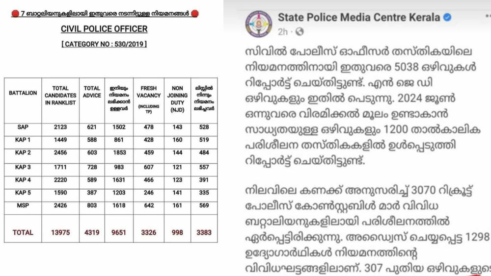 5,038 പേർക്ക് നിയമനം നൽകിയെന്നാണ് പോലീസിന്റെ ഔദ്യോഗിക ഫേസ്ബുക്ക് പേജിലെ കണക്ക്. 3,326 ഒഴിവുകളിലേക്ക് മാത്രമാണ് ഇതുവരെ നിയമനം നടന്നതെന്ന് ഉദ്യോഗാർത്ഥികൾ വ്യക്തമാക്കി. ബാക്കിയുള്ള ഒഴിവുകൾ റാങ്ക് ലിസ്റ്റിലുള്ള ഉദ്യോഗാർത്ഥികൾ തന്നെ ശേഖരിച്ച് നൽകിയ എൻജെഡി ഒഴിവുകളാണ്. വനിതാ കോൺസ്റ്റബിൾ, പോലീസ് ഡ്രൈവർ, എസ്.സി-എസ്.ടി സ്പെഷ്യൽ റിക്രൂട്ട്മെന്റ്, പോലീസ് ടെലി കമ്യൂണിക്കേഷൻ നിയമനങ്ങളും ഈ കണക്കിൽ ഉൾക്കൊള്ളിച്ചിരിക്കുകയാണെന്നും ഉദ്യോഗാർത്ഥികൾ തെളിവ് സഹിതം സമർത്ഥിച്ചു.