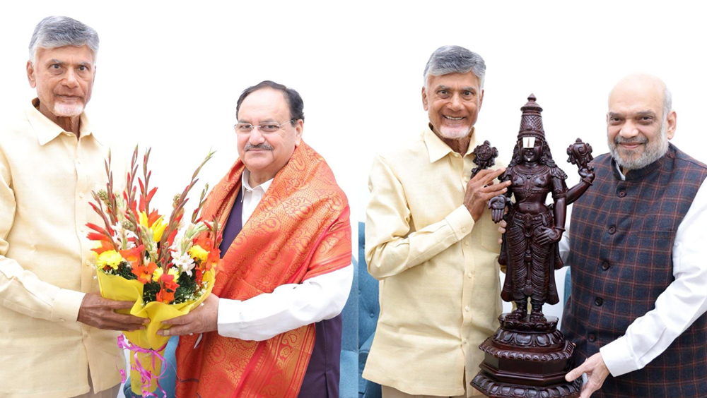 ന്യൂഡൽഹി: തെലുങ്ക് ദേശം പാർട്ടി എൻഡിഎയിൽ മടങ്ങിയെത്തുമെന്ന റിപ്പോർട്ടുകൾക്ക് പിന്നാലെ ഡൽഹിയിലെത്തി ബിജെപി നേതാക്കളെ കണ്ട് പാർട്ടി അദ്ധ്യക്ഷൻ ചന്ദ്രബാബു നായിഡു. ബിജെപി അദ്ധ്യക്ഷൻ ജെ.പി. നദ്ദ, കേന്ദ്ര ആഭ്യന്തരമന്ത്രി അമിത് ഷാ എന്നിവരെ നായിഡു സന്ദർശിച്ചു. മുന്നണി പ്രവേശനം സംബന്ധിച്ച് നേതാക്കൾ തമ്മിൽ ചർച്ചയായതായാണ് ലഭിക്കുന്ന വിവരം.