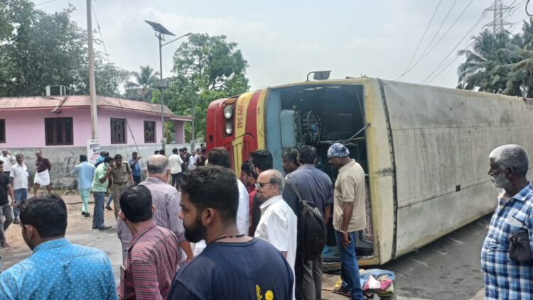 കോട്ടയം: എം.സി റോഡിൽ കുര്യത്ത് കാറുമായി കൂട്ടിയിടിച്ച് കെഎസ്ആർടിസി ബസ് മറിഞ്ഞു. കോട്ടയത്ത് നിന്ന് മൂന്നാറിലേക്ക് പോകുകയായിരുന്ന സൂപ്പർ ഫാസ്റ്റ് ബസാണ് മറിഞ്ഞത്. ഇന്ന് രാവിലെ 11 മണിയോടെയായിരുന്നു അപകടം നടന്നത്. അപകടത്തിൽ നിരവധി പേർക്ക് പരിക്കേറ്റു. ഇവരെ സമീപത്തെ സ്വകാര്യ ആശുപത്രിയിൽ പ്രവേശിപ്പിച്ചു. ആരുടെയും പരിക്ക് ഗുരുതരമല്ലെന്നാണ് വിവരം.