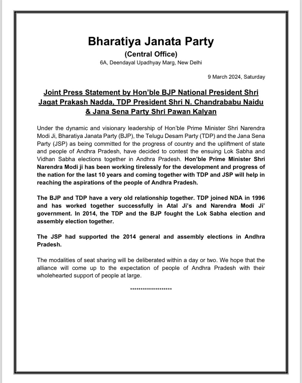 സീറ്റ് വിഭജനം സംബന്ധിച്ച കാര്യങ്ങളിൽ രണ്ട് ദിവസത്തിനകം അന്തിമ തീരുമാനമാകുമെന്നും പ്രസ്താവയിൽ വ്യക്തമാക്കുന്നു. ബിജെപി ​ദേശീയ നേതൃത്വവുമായി വെള്ളിയാഴ്ച രാത്രി നടന്ന അന്തിമ ചർച്ചയിലാണ് ടിഡിപിയും ജെഎസ്പിയും സഖ്യത്തിലേക്ക് എത്തുന്നത് സംബന്ധിച്ച് തീരുമാനയത്. ഇതിന് മുന്നോടിയായി അമിത് ഷായുടെ വസതിയിൽ നദ്ദയുടെ സാന്നിധ്യത്തിൽ ജെഎസ്പി നേതാവ് പവൻ കല്യാൺ കൂടിക്കാഴ്ച നടത്തിയിരുന്നു.