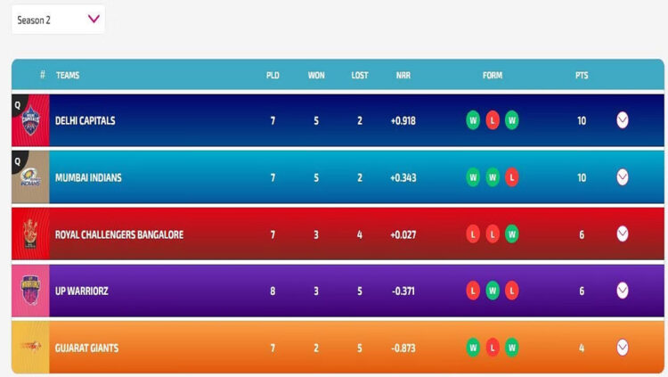 വനിതാ പ്രീമിയർ ലീഗിൽ ആദ്യ മൂന്ന് സ്ഥാനങ്ങൾക്കായുള്ള കനത്ത പോരാട്ടത്തിൽ ടീമുകൾ. നിലവിൽ പോയിന്റ് പട്ടികയിൽ ഏഴ് മത്സരങ്ങളിൽ നിന്ന് 10 പോയിന്റുമായി ഡൽഹി ക്യാപിറ്റൽസാണ് മുന്നിൽ. തൊട്ടുപിന്നിൽ ഏഴ് മത്സരങ്ങളിൽ നിന്ന് 10 പോയിന്റുമായി മുംബൈയുമുണ്ട്. നെറ്റ് റൺറേറ്റിന്റെ അടിസ്ഥാനത്തിലാണ് ഡൽഹി ഒന്നാമതെത്തിയത്.
