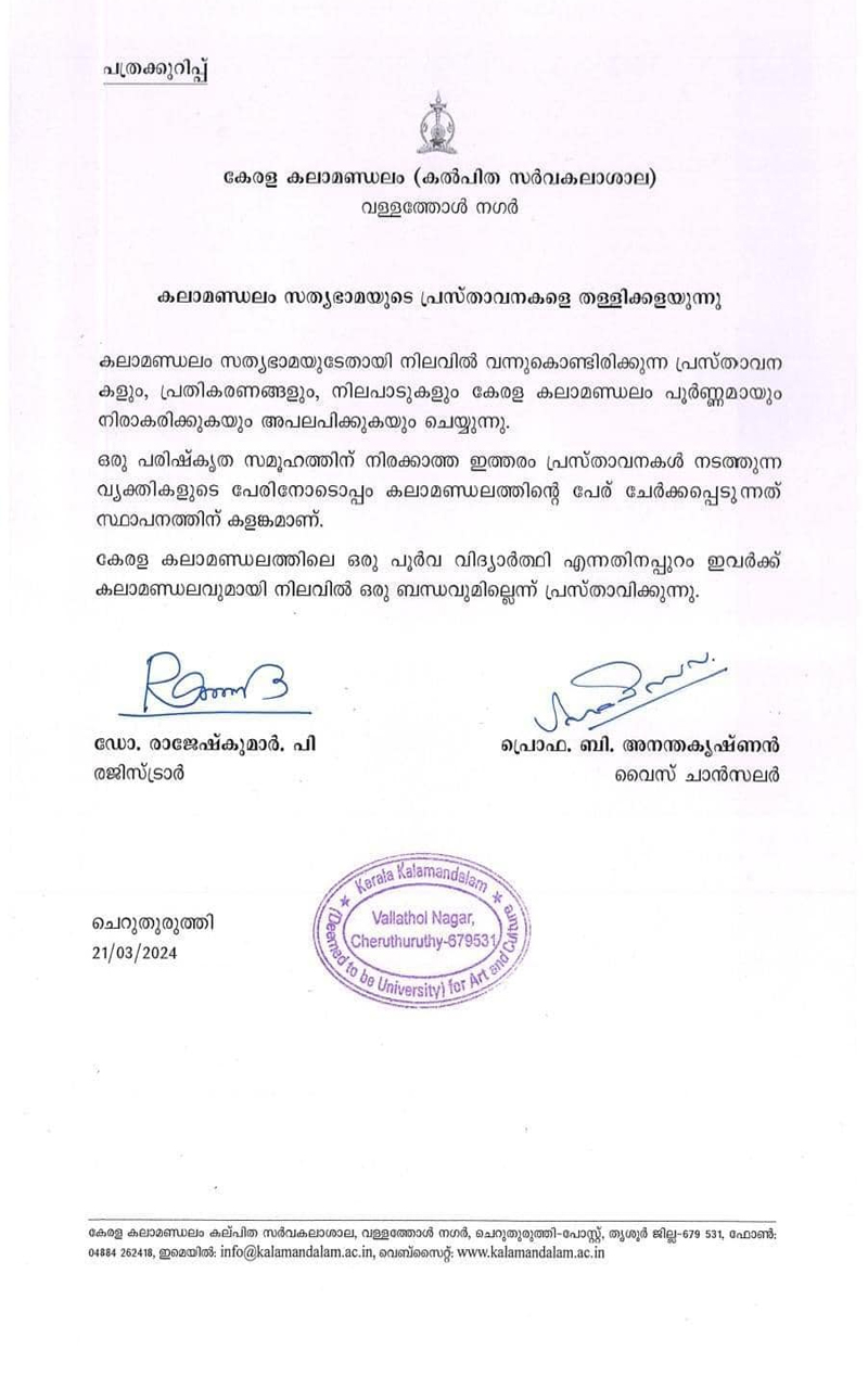 ‘കലാമണ്ഡലം സത്യഭാമയുടേതായി നിലവിൽ വന്നുകൊണ്ടിരിക്കുന്ന പ്രസ്താവനകളും പ്രതികരണങ്ങളും നിലപാടുകളും കേരള കലാമണ്ഡലം പൂർണ്ണമായും നിരാകരിക്കുകയും അപലപിക്കുകയും ചെയ്യുന്നു. ഒരു പരിഷ്‌കൃത സമൂഹത്തിന് നിരക്കാത്ത ഇത്തരം പ്രസ്താവനകൾ നടത്തുന്ന വ്യക്തികളുടെ പേരിനോടൊപ്പം കലാമണ്ഡലത്തിന്റെ പേര് ചേർക്കുന്നത് സ്ഥാപനത്തിന് കളങ്കമാണ്. കേരള കലാമണ്ഡലത്തിലെ പൂർവ്വ വിദ്യാർത്ഥി എന്നതിനപ്പുറം ഇവർക്ക് കലാമണ്ഡലവുമായി നിലവിൽ ഒരു ബന്ധവുമില്ലെന്ന് പ്രസ്താവിക്കുന്നതായി’  പത്രകുറിപ്പിലൂടെ വ്യക്തമാക്കി.