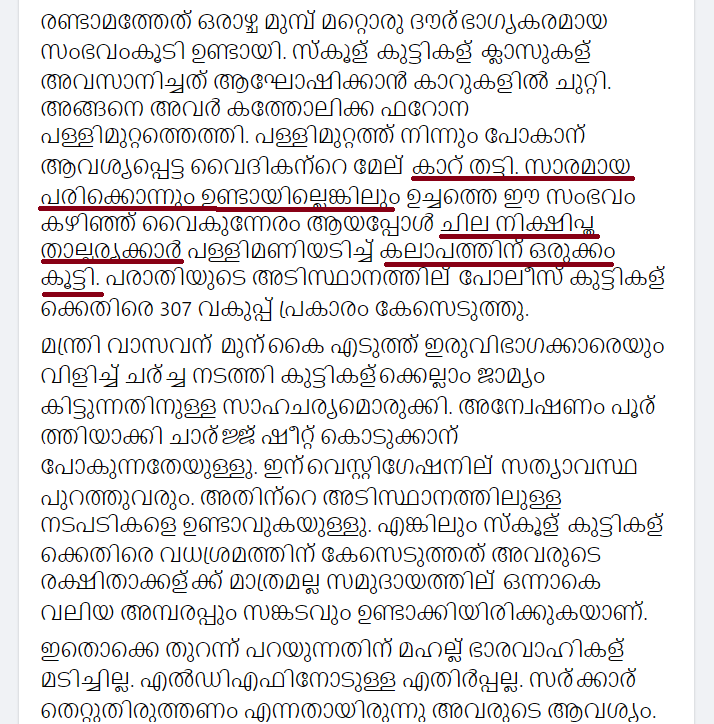 ” ഒരാഴ്ച മുമ്പ് മറ്റൊരു ദൗര്ഭാഗ്യകരമായ സംഭവംകൂടി ഉണ്ടായി. സ്കൂള് കുട്ടികള് ക്ലാസുകള് അവസാനിച്ചത് ആഘോഷിക്കാൻ കാറുകളിൽ ചുറ്റി. അങ്ങനെ അവർ കത്തോലിക്ക ഫറോന പള്ളിമുറ്റത്തെത്തി. പള്ളിമുറ്റത്ത് നിന്നും പോകാന് ആവശ്യപ്പെട്ട വൈദികന്റെ മേല് കാറ് തട്ടി. സാരമായ പരിക്കൊന്നും ഉണ്ടായില്ലെങ്കിലും ഉച്ചത്തെ ഈ സംഭവം കഴിഞ്ഞ് വൈകുന്നേരം ആയപ്പോൾ ചില നിക്ഷിപ്ത താല്പര്യക്കാർ പള്ളിമണിയടിച്ച് കലാപത്തിന് ഒരുക്കം കൂട്ടി. പരാതിയുടെ അടിസ്ഥാനത്തില് പോലീസ് കുട്ടികള്ക്കെതിരെ 307 വകുപ്പ് പ്രകാരം കേസെടുത്തു.