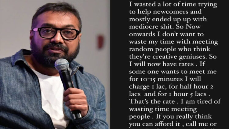 15 മിനിറ്റിന് ഒരു ലക്ഷം, അരമണിക്കൂറിന് രണ്ട് ലക്ഷം; ഒരു മണിക്കൂറിന് അഞ്ചു ലക്ഷം; കൂടിക്കാഴ്ചയ്‌ക്ക് ഫീസ് നൽകണമെന്ന് അനുരാഗ് കശ്യപ്