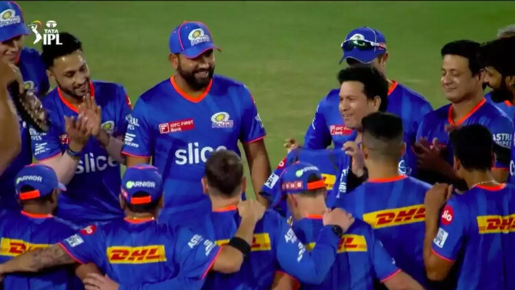 ഐപിഎല്ലിൽ മുംബൈക്കായി 200-ാം മത്സരത്തിനിറങ്ങിയ രോഹിത് ശർമ്മയ്‌ക്ക് പ്രത്യേക സമ്മാനവുമായി മുൻ താരം സച്ചിൻ ടെൻഡുൽക്കർ. മത്സരത്തിന് മുൻപാണ് താരം രോഹിത്തിന് ടീമിന്റെ ഭാ​ഗത്ത് നിന്നുള്ള പ്രത്യേക ജഴ്സി സമ്മാനിച്ചത്. 200 എന്ന് എഴുതിയ ജഴ്സിയാണ് സച്ചിൻ മുംബൈയുടെ മുൻ നായകന് നൽകിയത്. കൈയടികളോടെയാണ് രോഹിത്തിന്റെ നാഴികകല്ലിന് ടീമം​ഗങ്ങൾ ആശംസയറിയിച്ചത്.