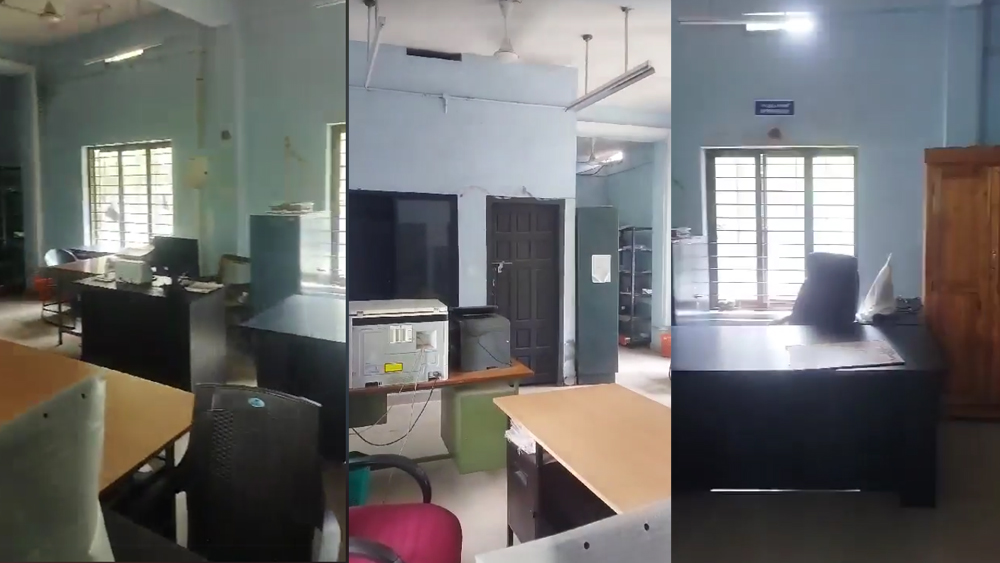 രാവിലെ എട്ട് മണിക്ക് തുടങ്ങേണ്ട ക്ലാസാണെന്നും അദ്ധ്യാപകർ എത്തിയിട്ടില്ലെന്നും വിദ്യാർത്ഥികൾ പറയുന്നു. വിദ്യാർത്ഥികൾ കൃത്യസമയത്തെത്തി. എന്നാൽ പത്തര മണിയായിട്ടും ഒരു അദ്ധ്യാപകർ പോലും സ്ഥലത്തെത്തിയിട്ടില്ല. വീഡിയോയിലൂടെയാണ് വിദ്യാർത്ഥികൾ പ്രതികരിച്ചത്. സ്റ്റാഫ് മുറിയിൽ ഒഴിഞ്ഞുകിടക്കുന്ന കസേരകളും മേശകളും വീഡിയോയിൽ കാണാം. സംഭവത്തിൽ പ്രതിഷേധവുമായി മുന്നോട്ട് പോകാനാണ് വിദ്യാർത്ഥികളുടെ നീക്കം.