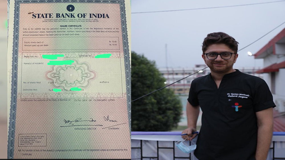 ഡോക്ടറുടെ മുത്തച്ഛൻ 1994-ലാണ് 500 രൂപ കൊടുത്ത് എസ്ബിഐ (സ്റ്റേറ്റ് ബാങ്ക് ഓഫ് ഇന്ത്യ) ഓഹരികൾ വാങ്ങിയത്. അന്ന് വാങ്ങിയ ഷെയർ സർട്ടിഫിക്കറ്റാണ് ഡോക്ടർ കഴിഞ്ഞ ദിവസം കണ്ടെത്തിയത്. ഇന്ന് അതിന്റെ മൂല്യം 3. 75 ലക്ഷം രൂപയാണ്. ഏകദേശം 750 മടങ്ങ് കൂടുതൽ. “ഇക്വിറ്റി ഹോൾഡിംഗ് ശക്തി” എന്ന തലക്കെട്ടൊടെ തൻമയ് പങ്കുവെച്ച് ഷെയർ സർട്ടിഫിക്കിന്റെ ചിത്രം സമൂഹ മാദ്ധ്യമങ്ങളിൽ വൈറലാണ്.